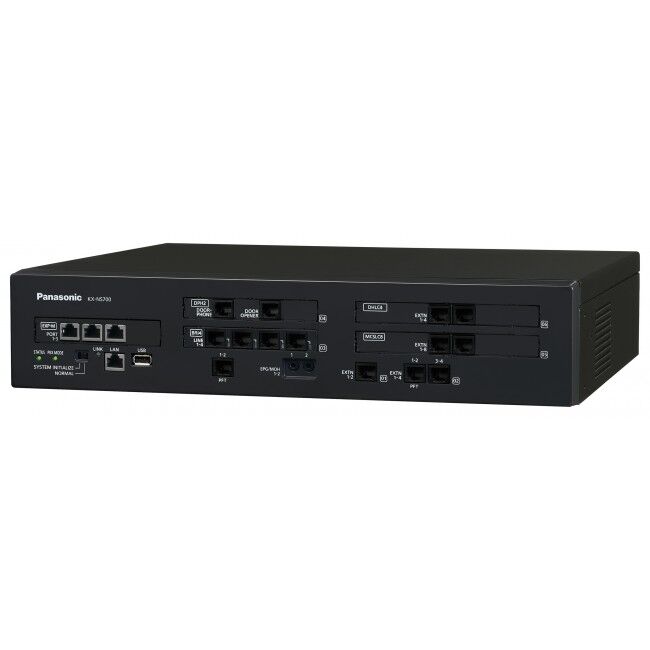 Hlavná jednotka Panasonic KX-NS700, v základe 4 x CLIP analógová + 2 x digitálna klapka, 2 x záložný port v prípade výpadku napájania, 2 kanály DISA / vstavané hlasové schránky s kapacitou 2 hodiny záznamu, napájací zdroj, kit do 19″ racku, rozšírenie až až 32/64 vonkajších kanálov VoIP (H.323/SIP), až 190 vonkajších liniek (ISDN/analog), až 288 vnútorných liniek (ANALÓG/DIGITÁL/MGCP/SIP) LAN rozhranie 10/100 BASE-T/100BASE-TX, sieťovanie Q-SIG (VoIP/PRI/BRI), smerovanie ARS/LCR, výstavba DECT systému, ICD skupiny, VIP hovor ,…….